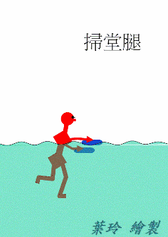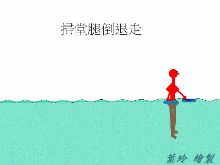 扫堂腿倒退走-扫堂腿加上倒退走。单手扶牆或双手侧持浮具(贴水面)平衡保持,做每一下扫堂腿的向后划半圆,就顺势后退一步站,换腿向后划半圆。
