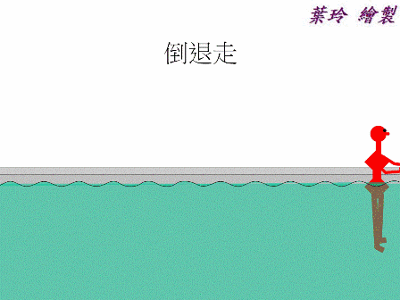 倒退走-练习中身体平衡、熟悉水浮力。健侧手先扶牆,小步慢慢向后退,沿水池边走至末端再回头,换患侧手先扶牆慢慢行走,来回轮流4至5分钟。全程不加速。