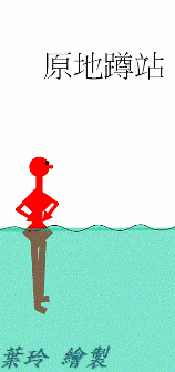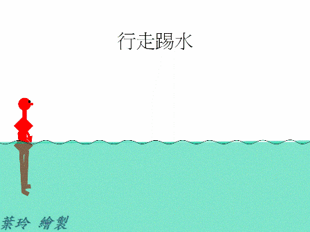 直线移位(浅水区)-此类活动需要前进或后退,以身体平衡为目标。当患侧为支撑脚时,动作宜放慢、可适度蹲低。叮咛:水中步行时,宜穿著水中专用鞋,每一步皆需踏到底。若只用脚尖,会造成上岸后小腿肌肉僵硬。