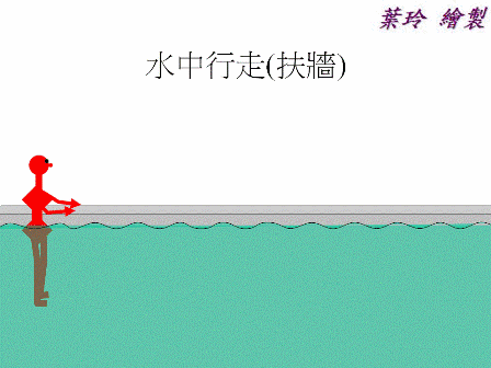 水中散步-练习中身体平衡、熟悉水浮力。健侧手先扶牆慢慢向前行走,沿水池边走至末端再回头,换患侧手先扶牆慢慢行走,来回轮流4至5分钟。在举腿行走时,速度应该保持在有阻力的感觉,利用水的阻力锻练臀部和腿部。若感觉身体平衡良好,渐渐加快步伐,进而渐渐放手不扶牆,改为双手侧持浮具(贴水面)或徒手拨水维持平衡。