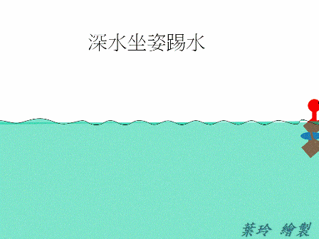 深水坐姿踢水-增加膝关节活动度、肌力、训练心肺耐力。像坐椅子的姿势,保持脊椎垂直、大腿水平的姿势、收小腹,轮流屈伸膝(踢、收小腿),双手在胸前做推出或收拢的拨水动作,以保持平衡。