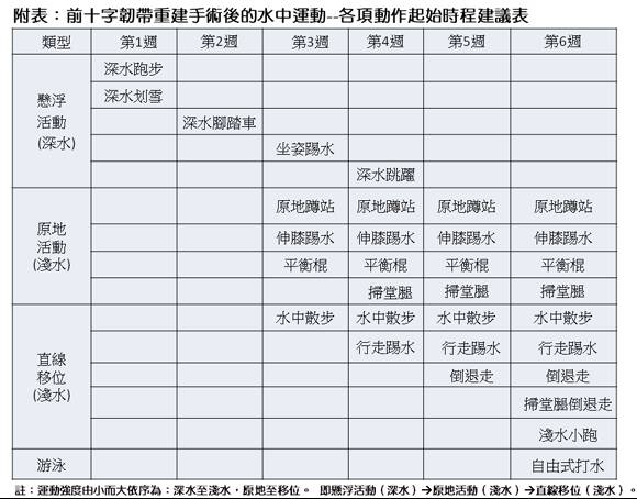 水中运动的动作搭配浮具与水深,能够有许多种变化,运动强度依序由小而大,原则为深水至浅水,原地至移位。以下介绍几个适合在术后6週内练习的水中运动,而各项动作依序为:悬浮活动(深水)、原地活动(浅水)、直线移位(浅水),如下方附表。