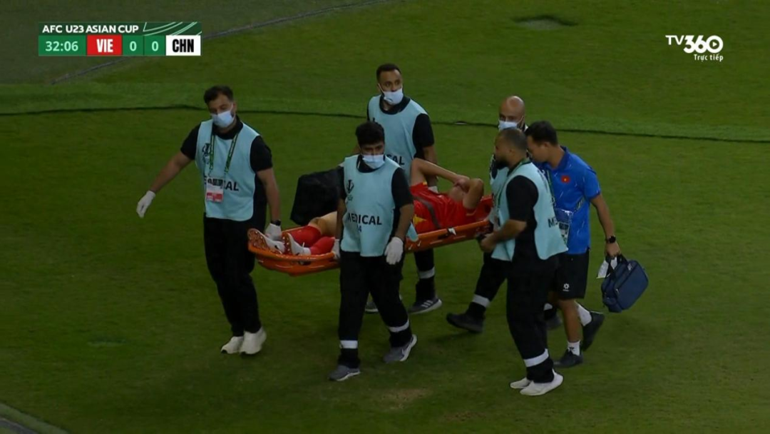 U23亚洲杯半决赛中,越南U23中卫阮晓明在一次对抗中受伤倒地,被担架抬离赛场。