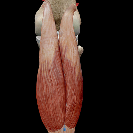 腓肠肌分内侧头和外侧头,从大腿骨后面一直连到脚后跟(跟腱)。它在膝关节快伸直的时候屈膝作用最明显,但膝盖弯得越多,它的作用就越弱。