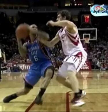 NBA常规赛中,雷霆后卫梅诺(蓝色球衣运动员)受伤离场的视频截图,赛后梅诺被诊断出右膝前交叉韧带撕裂,赛季报销。图中我们可以清楚地看到,他的右膝明显过度外展。