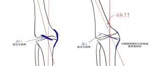 以Q角变大为例,Q角变大会增加膝关节外侧压力,拉扯膝关节内侧韧带,甚至可能诱发膝关节的疼痛。如图,Q角过大,胫骨过度外旋,股骨过度内旋,内侧副韧带先被拉长,降低膝关节稳定性,导致术后前叉不稳定因素增加,致使膝盖内扣。在患者回归运动之后,膝关节在内扣的状态下进行过度屈膝或者进行屈膝对抗运动时前交叉韧带也更容易受到损伤(如图)。