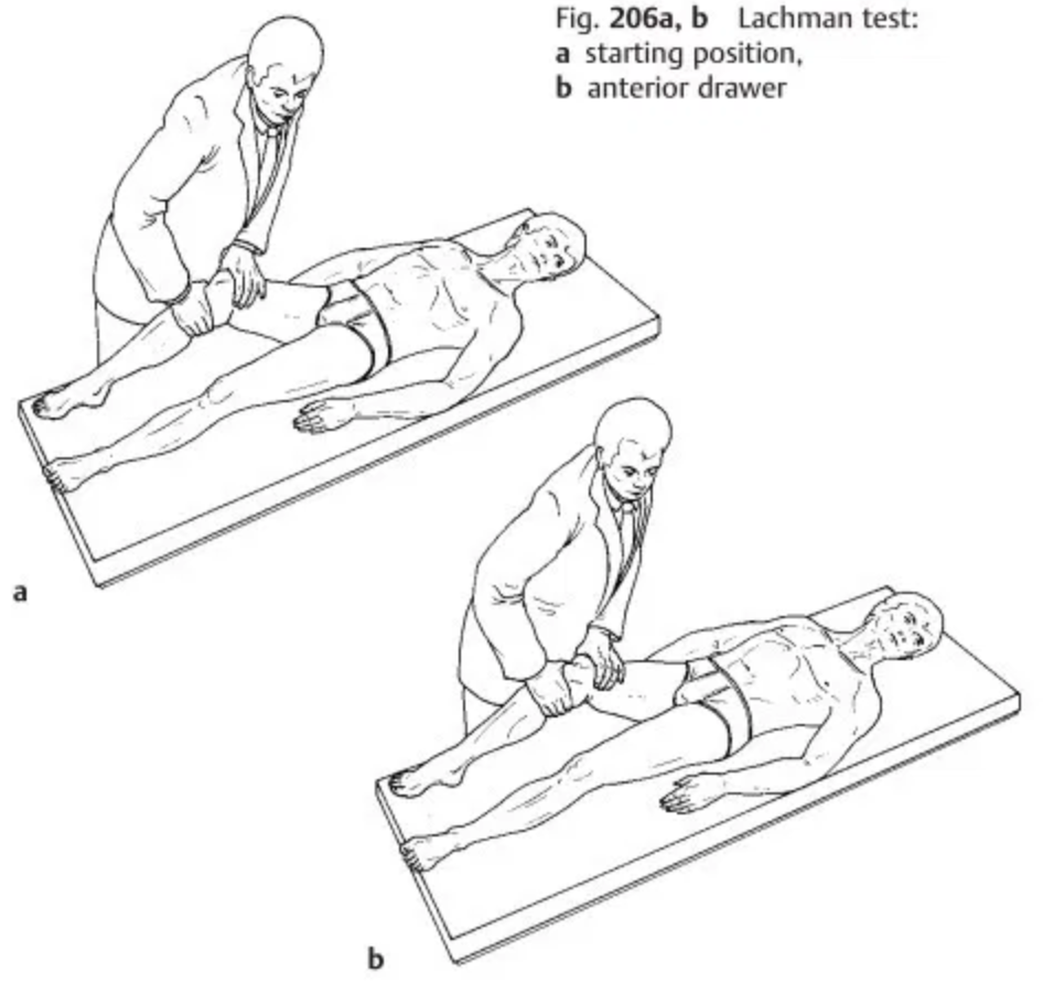 lanchman试验,病患仰卧且膝关节弯曲25-30度,向前拉胫骨近端测量其位移,向前位移量<3mm为正常