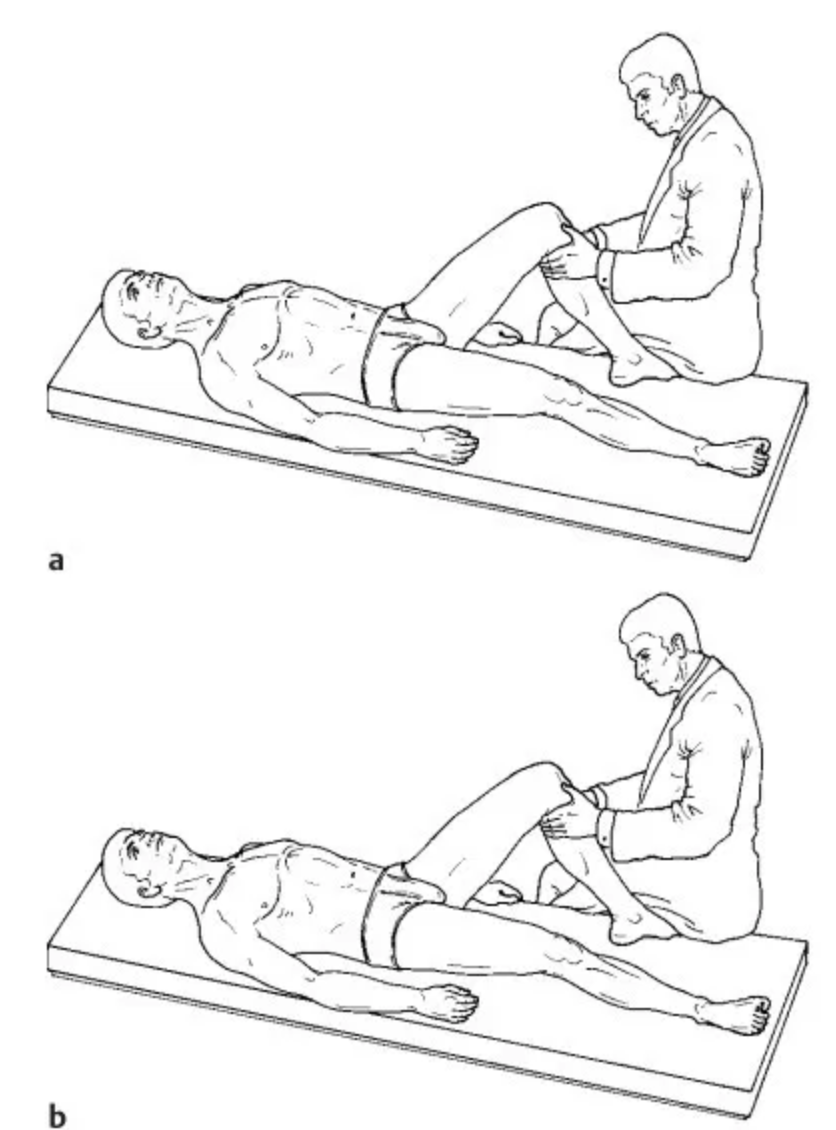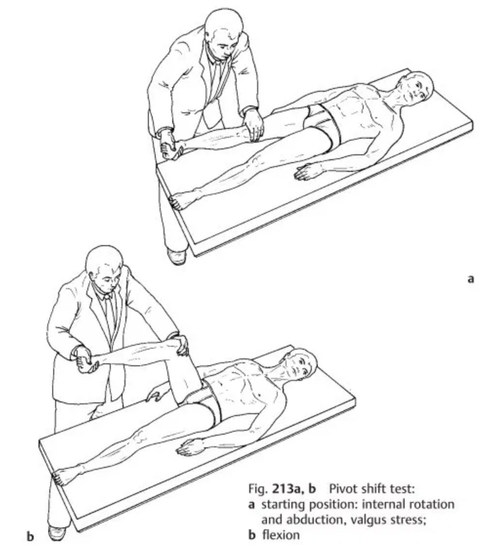 轴移试验,握住患者的脚使之内旋且完全伸直膝关节,施加膝关节外翻的力量时同时使膝关节弯曲,在30度左右时脱位的胫骨出现明显的反跳而复位是为阳性。